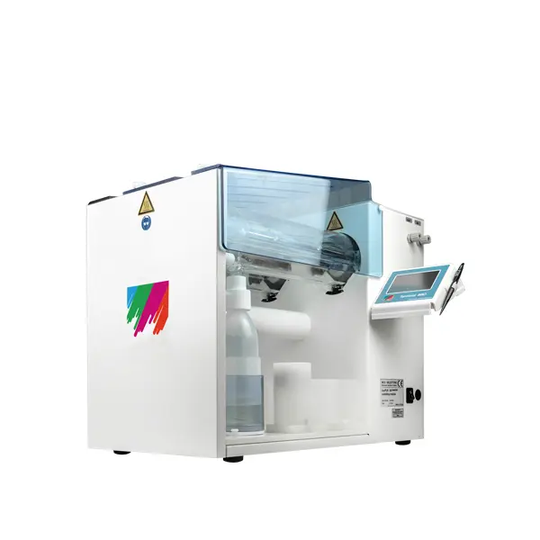 Das duoPUR besteht aus zwei Quarzdestillationsanlagen. Jede Einheit enthält zwei Infrarot-Heizelemente (1), einen wassergekühlten Kondensator (2), eine hochreine PFA-Auffangflasche (3) sowie ein vollautomatisches Säure-Befüll-/Entleer-System. Die verdampfte Säure wird am schräg abfallenden Kühler gesammelt und tropft in die Auffangflasche. Der Reinigungsprozess ist mikroprozessorgesteuert und ermöglicht dem Benutzer die Einstellung der Destillationszeit und des Leistungsniveaus Mithilfe eines modernen Touchscreens. Die Destillationsrate liegt je nach Leistungseinstellung und Kühlwassertemperatur zwischen 50 und 400 ml pro Stunde.